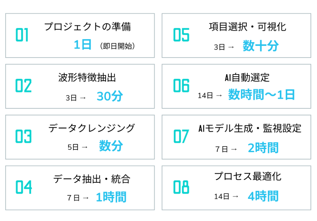 Smart Factory Insightは、以下の8つの主要機能によって構成されています。それぞれの工程において、大幅な時間短縮と効率化を実現します。